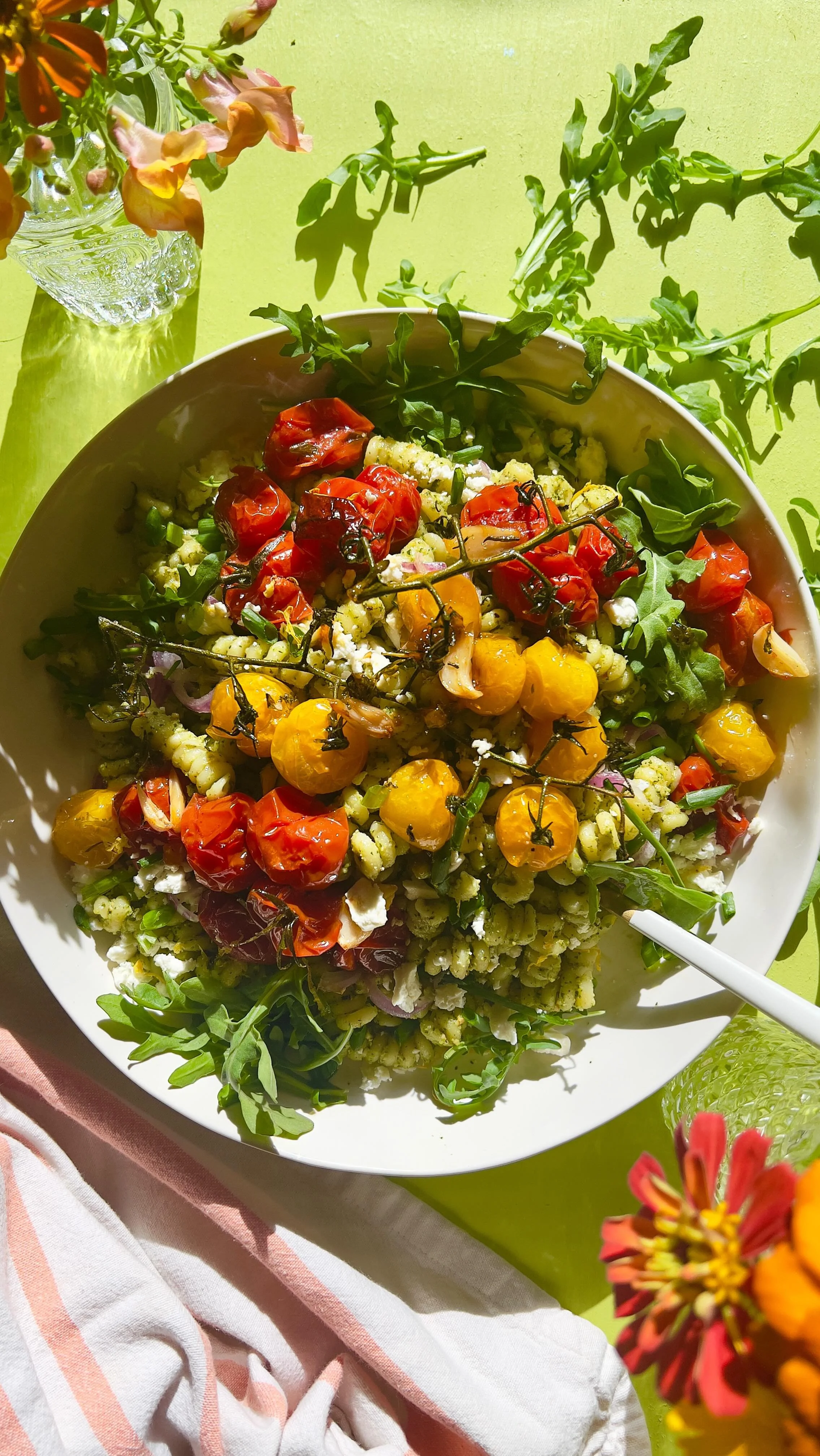 Arugula pesto pasta with roasted garlicky cherry tomatoes is bright, summery, and perfectly paired with anything coming off the grill. It’s delicious warm, room temp or straight out of the fridge. This pesto is creamy from cashews, bright and lemony, herbaceous and spicy from the combo arugula, basil and chives. In the pasta we’ve got more arugula, green and red onion, and feta. It’s everything I want for my summer dinner side. And for lunch the next day.