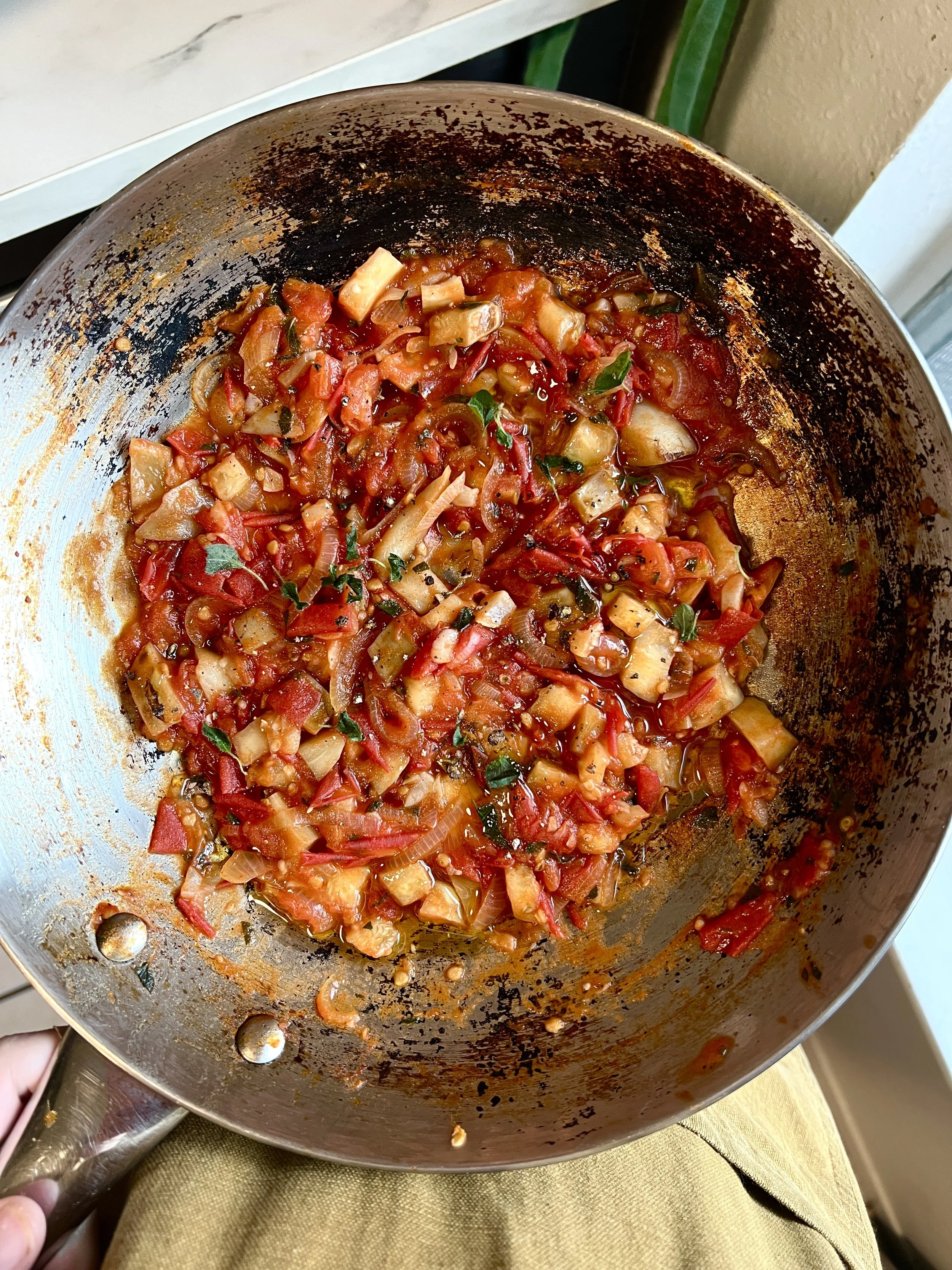 In a large saucepan, add olive oil and heat on medium high. Add in the eggplant and sprinkle with salt and a few cracks black pepper. Sauté for about 3 minutes or so, before adding in the tomatoes, garlic, onion, thyme, and a healthy sprinkle of salt and pepper. Stir in the wine and capers, allowing to come to a simmer. Reduce the heat to low, stirring regularly. On a low heat, the tomatoes will slowly release their juices, creating a sauce that coats the eggplant, which, at the same time is cooking down to a nice, stewed, jammy consistency. This low and slow process goes for about 30-40 minutes, or until said consistency is reached.
